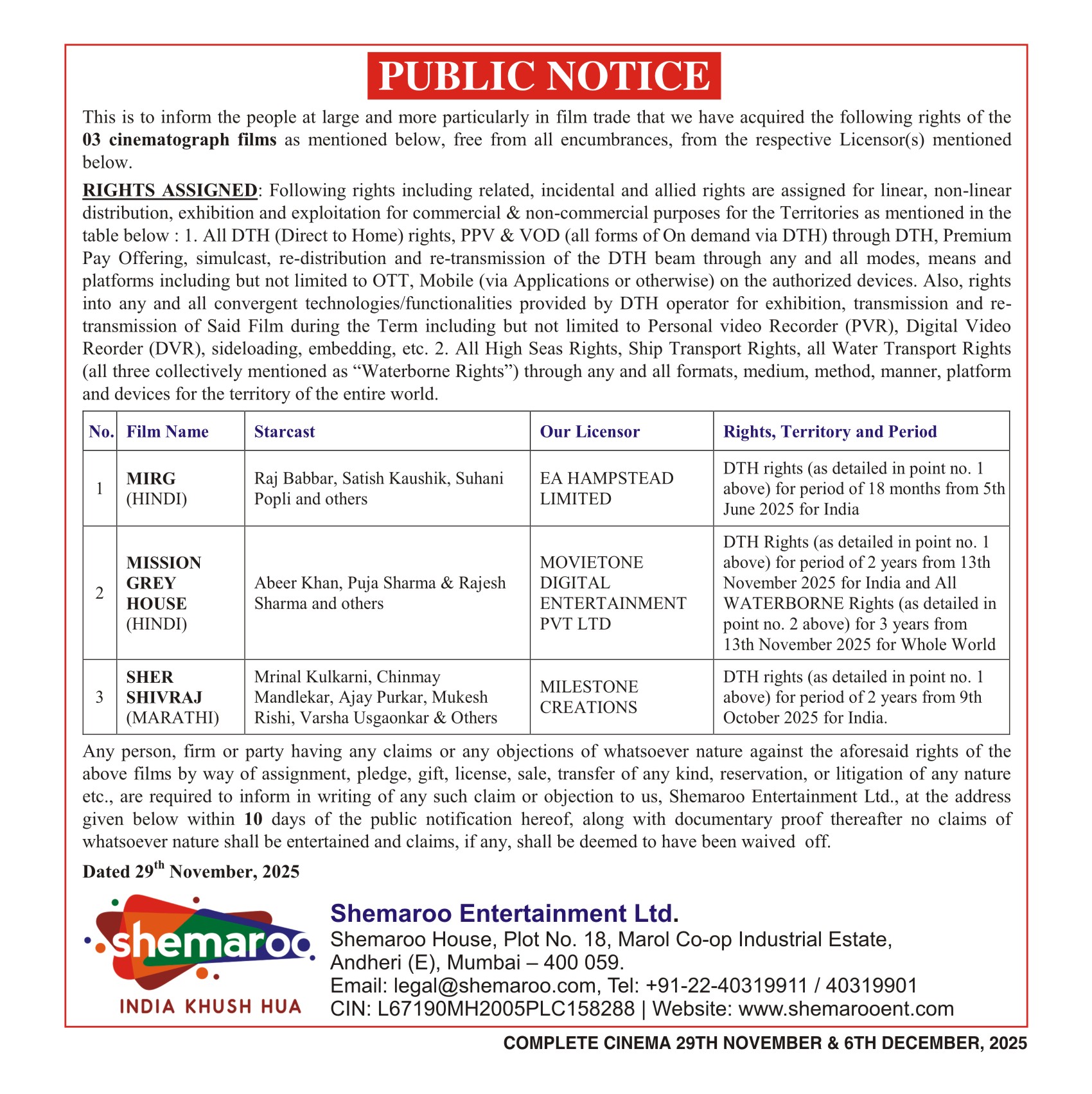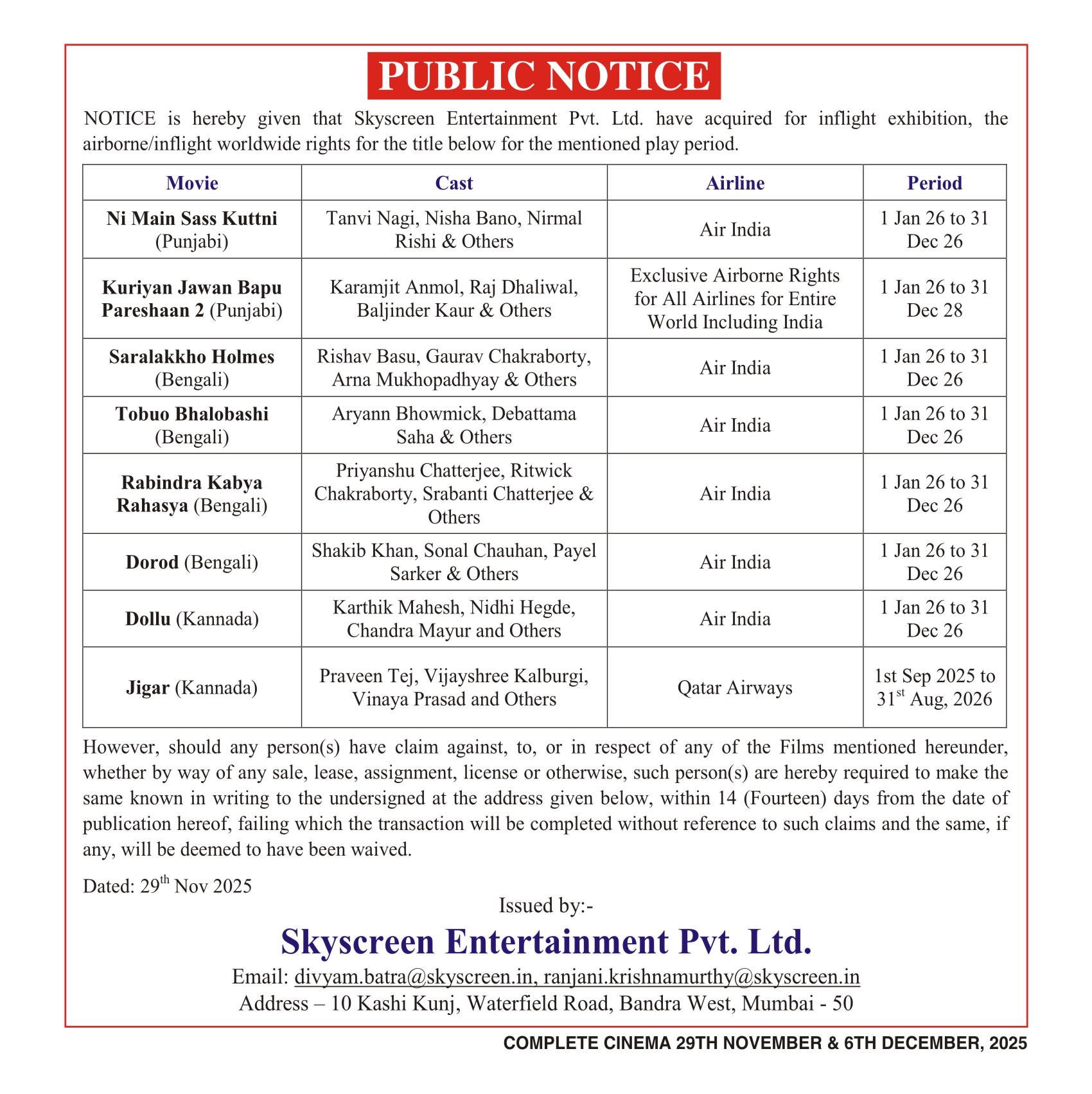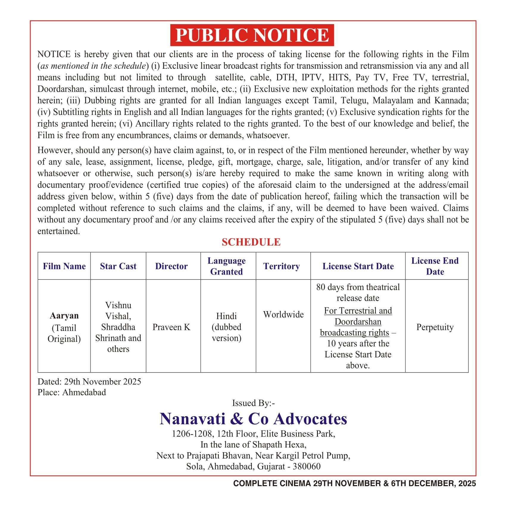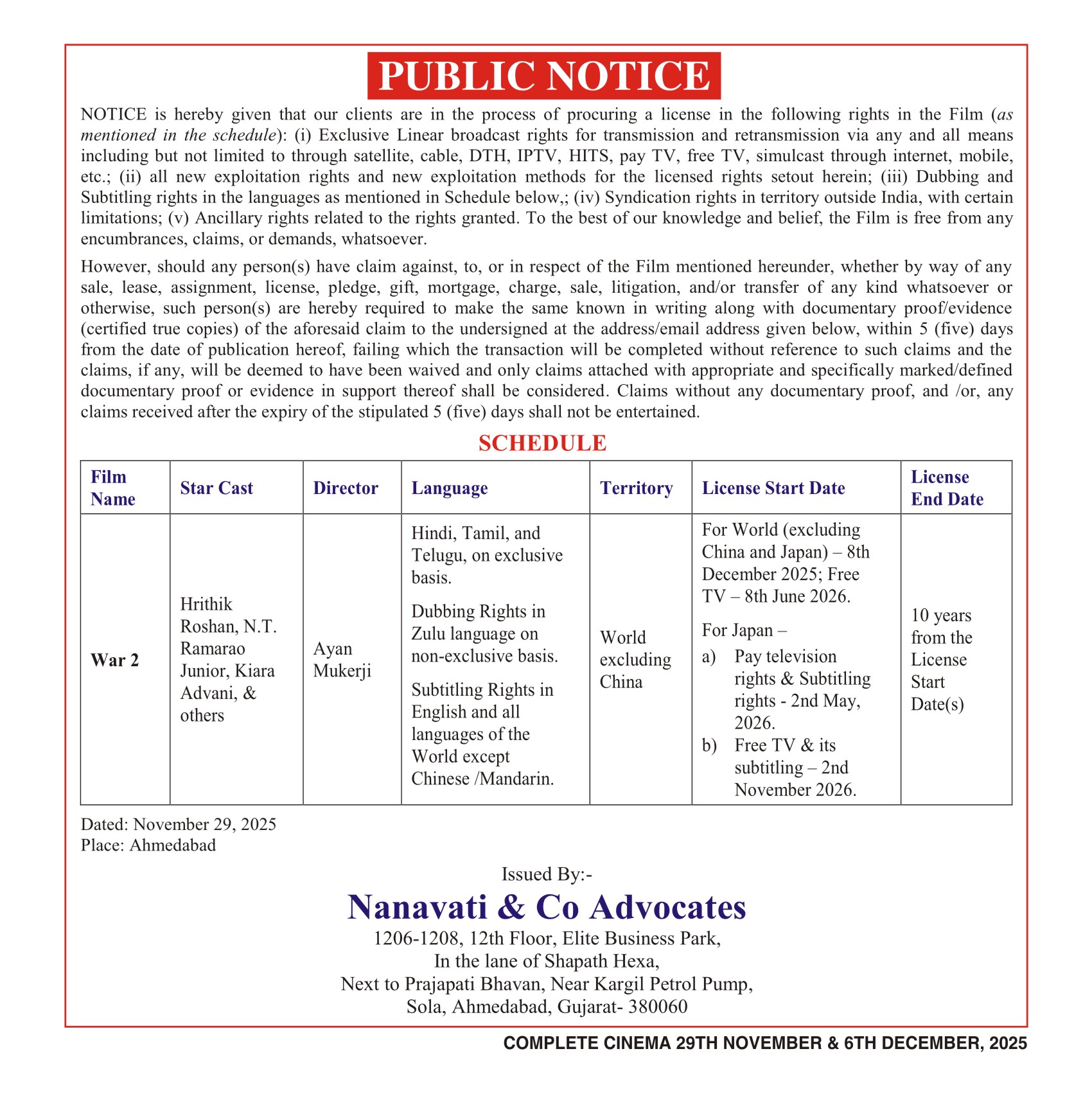 Period 29th November, 2025