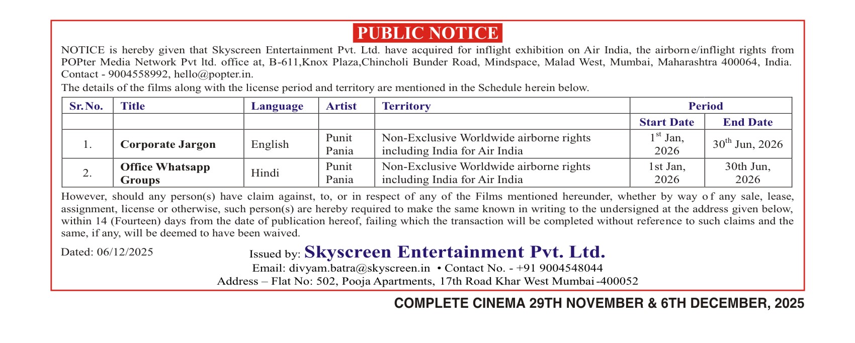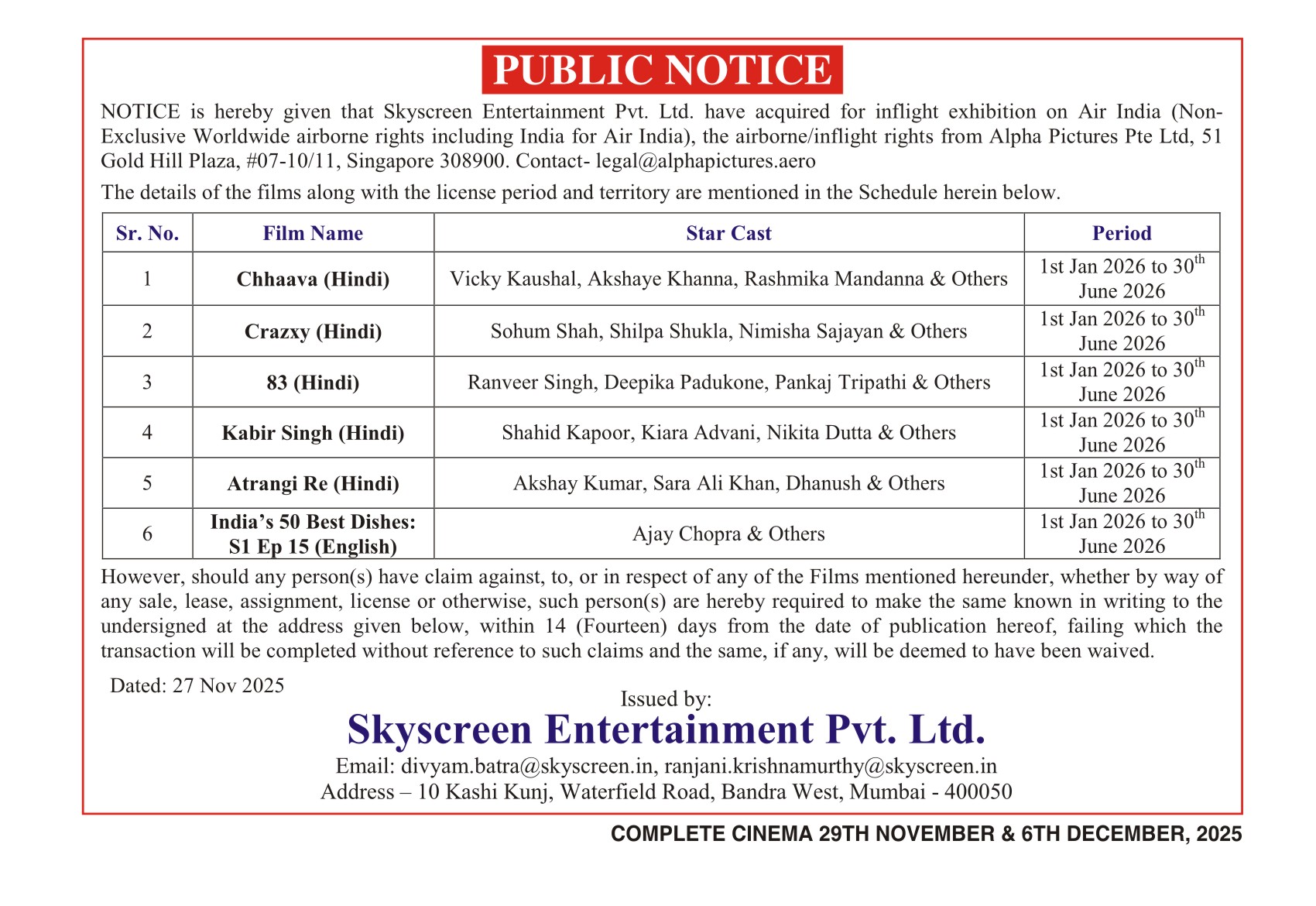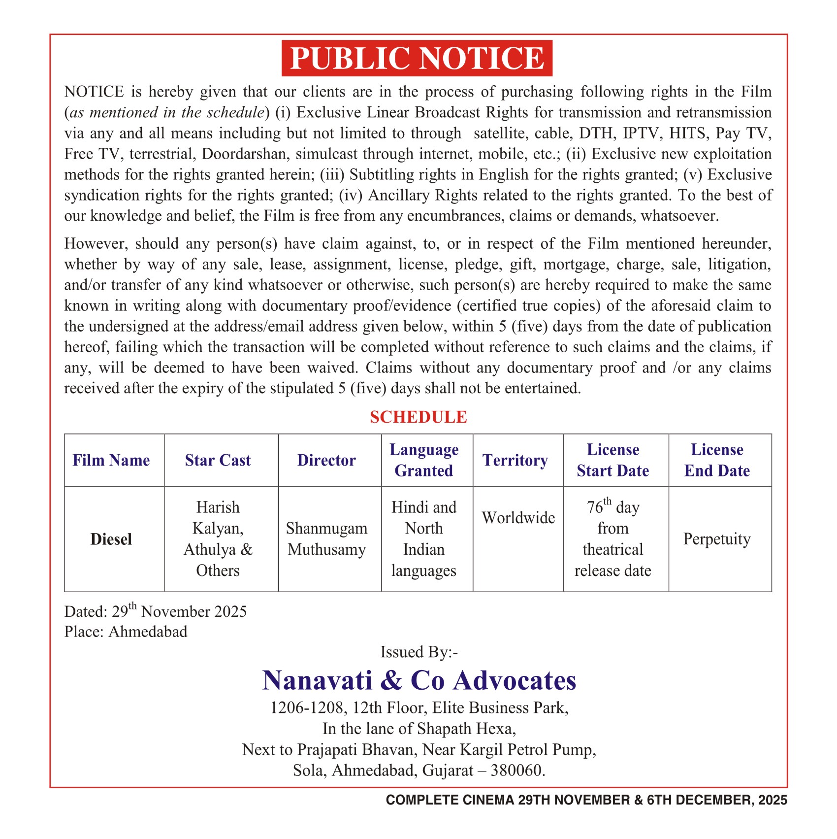 Period 29th November, 2025