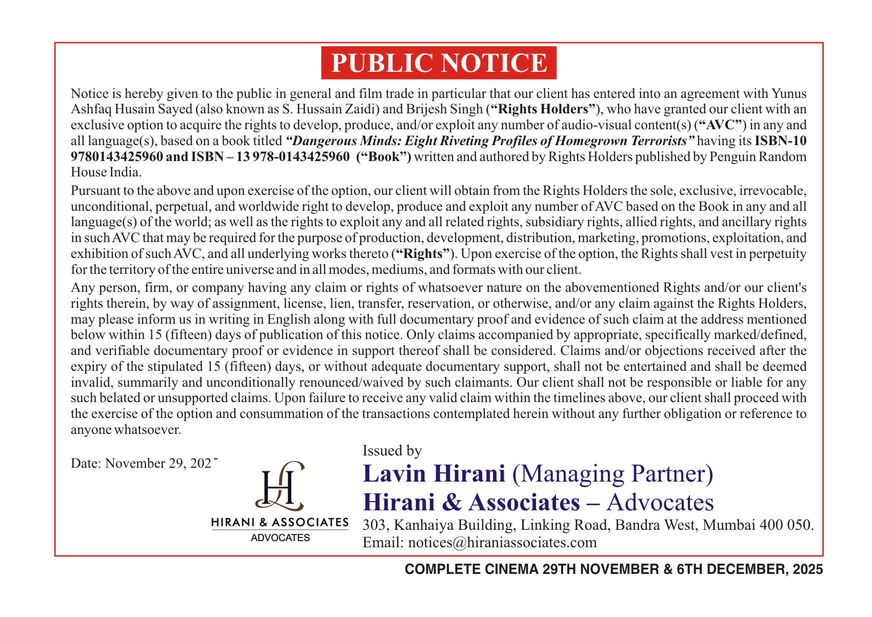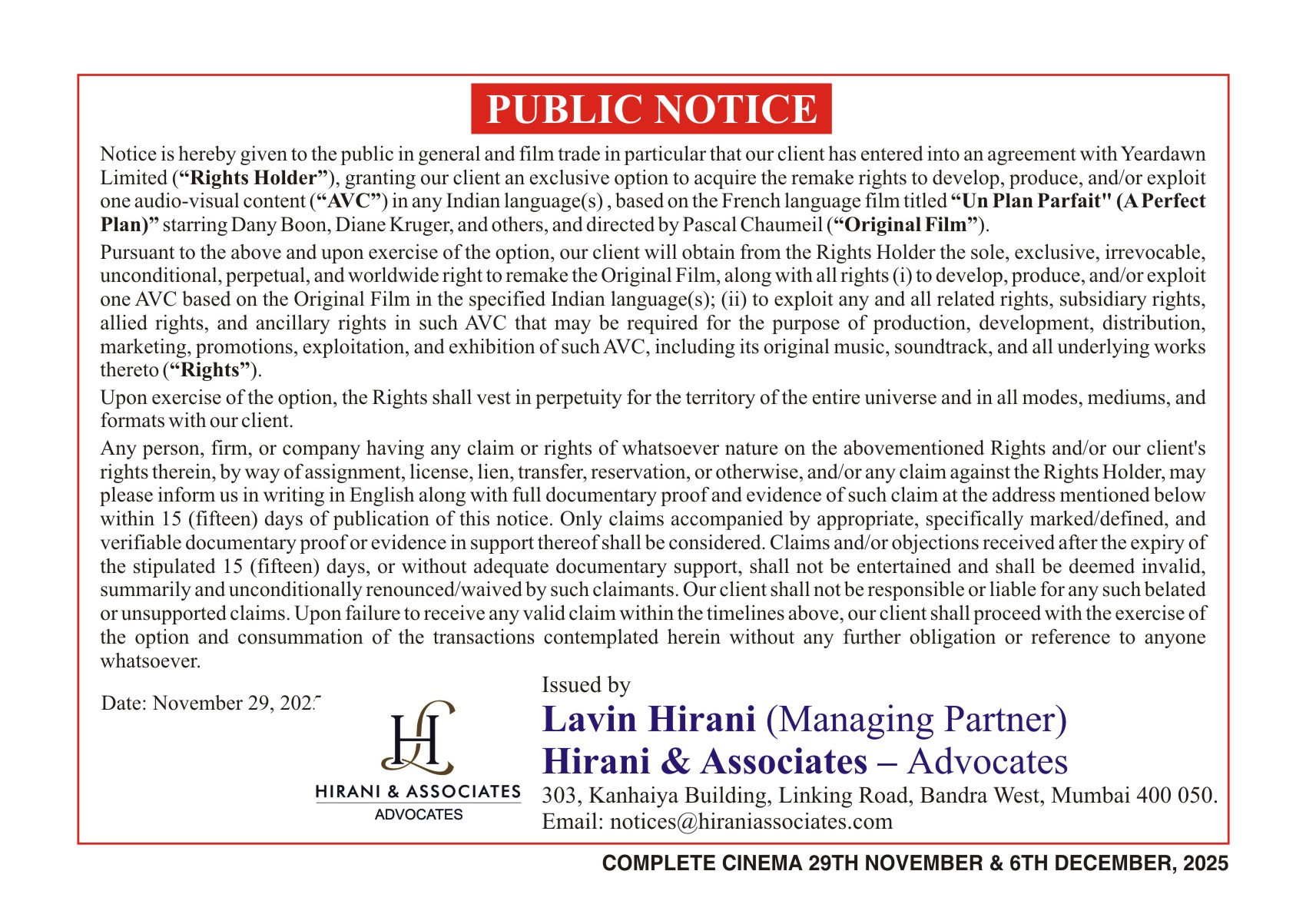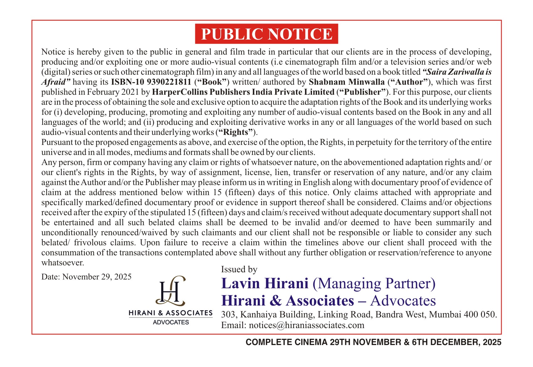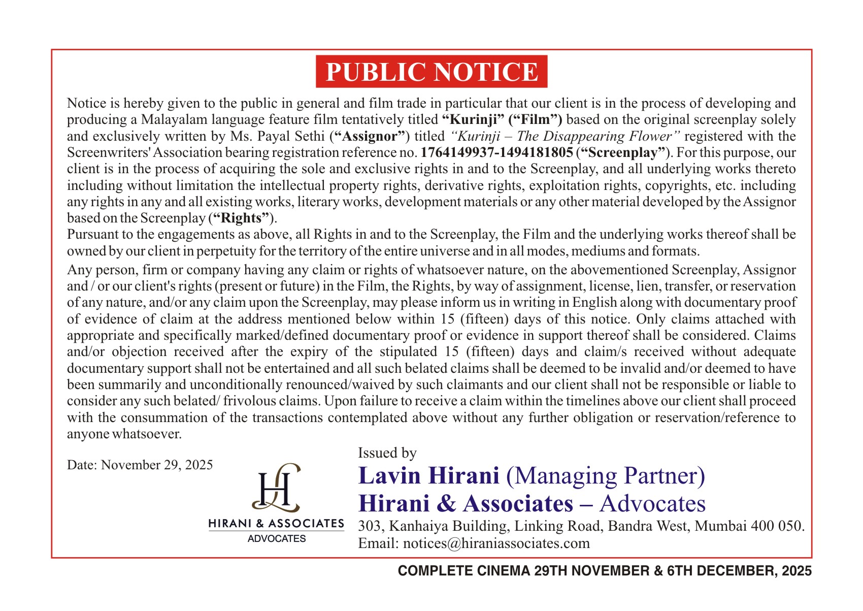 Period 29th November, 2025